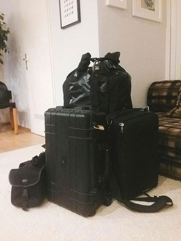 My luggage packed for this trip. (My photo equipment was already inside, so I had to use an iPhone to capture this image.) I had a 140l waterproof sack and a waterproof PELI style case in the checked baggage. The F-Stop gear bag (ICU) with lenses, camera and laptop was my hand baggage. Total weight of all this was over 40kg. (Click on picture to enlarge.)