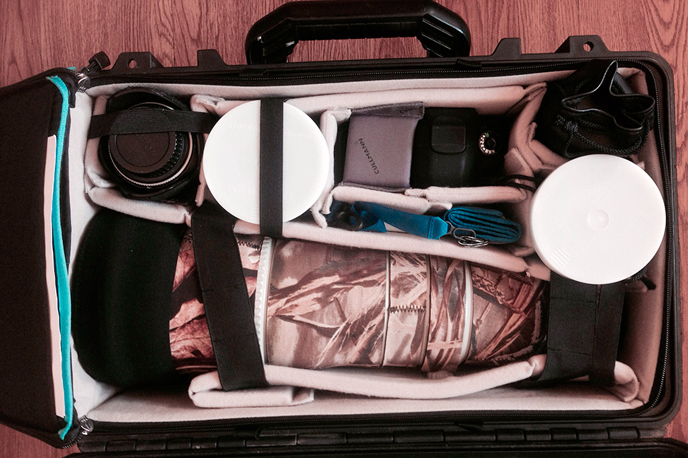 Because of the need to reduce the weight of the luggage I took only 5 lenses — 15mm, 18mm, 30mm, 85mm, 600mm — and only 1 camera body. All this could nicely fit into hand luggage. The case was compact but very heavy. (Click on picture to enlarge.)