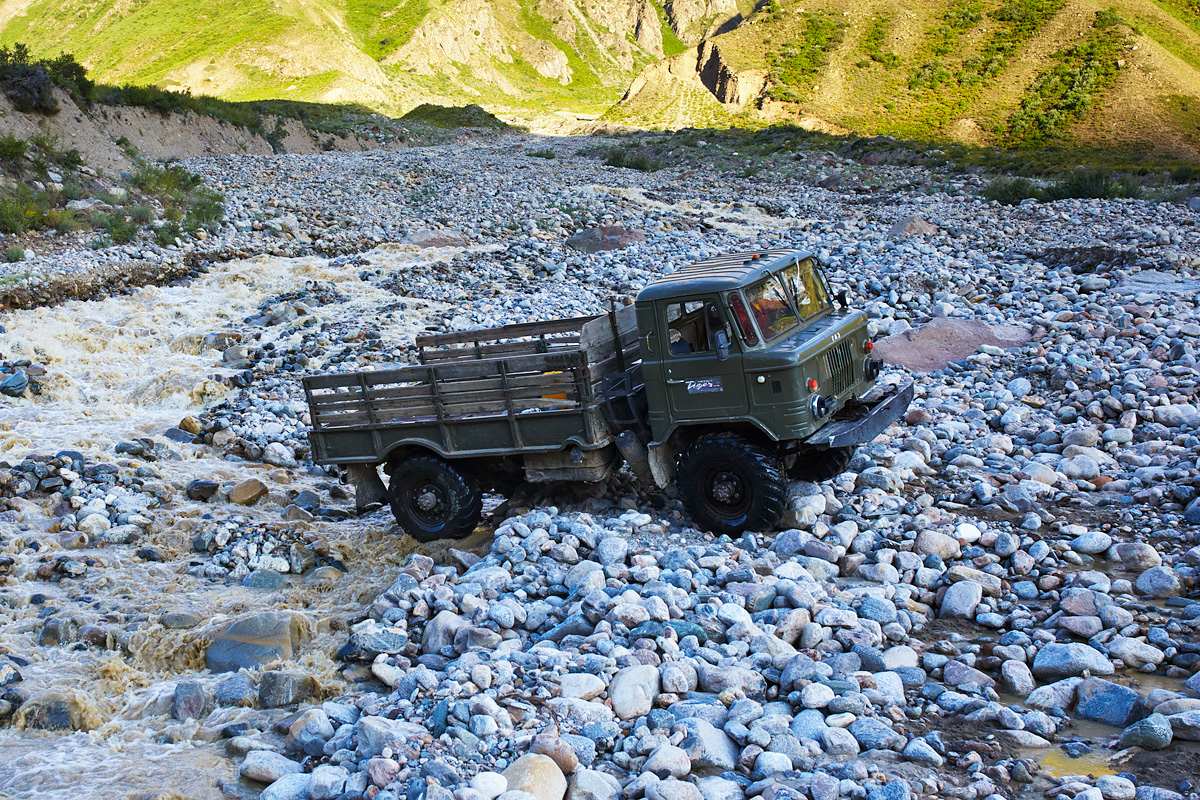 The cross-terrain capabilities of GAZ 66 are really impressive but this car is absolutely terrible for drive at long distances: The fuel consumption is huge. The driver of this vehicle requested from us 35 US$ for fuel for a 15 km roundtrip between Poimazor village and Bear's Glacier in Vanj Valley! The car was in so bad technical state that it was stopping every 500 meters, and we had to walk while the driver was fixing it. (Click on picture to enlarge.)