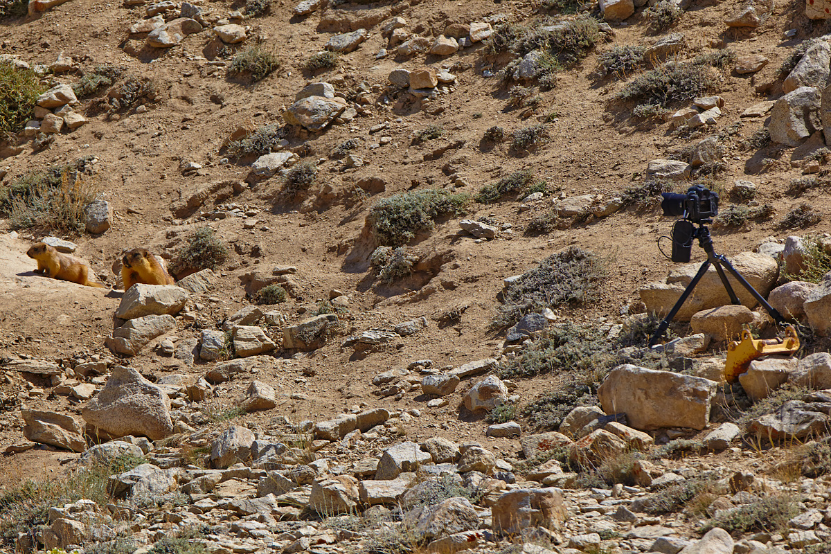 Even compared to the Western Pamir, the flora and the fauna of the Eastern and Central Pamir are very poor. Rodents and hares were the only mammals that we were seeing more or less frequently. Among rodents the Long-tailed Marmot (Marmota caudata) was certainly a highlight. The adult individuals of this species are quite large and with bride red fur — quite colourful. People in Kyrgyzstan and Tajikistan believe that the fat of the marmots is a medicine and also find their meat tasty. Therefore they hunt marmots wherever they can. Nevertheless they are quite common in many parts of Pamir and Alai. This was the third marmot species I photographed in my life, so I had already some experience that I could apply to this subject. Basically the approach was like with the Alpine and Steppe Marmots: When the marmot escaped in a burrow it will soon come out again; you only need to sit still and wait. Interestingly, the marmots notice the least movement and immediately get in panic. If the object isn't moving, they don't perceive it as danger — no matter, how large and strange looking it is. This allows to place a remotely controlled camera very close to a burrow of a marmot. The best place for photographing marmots during this trip was Sasyk Bulak hot spring at Yashilkul Lake. Other good places were at Lake Horgush in Central Pamir and in Little Alai.