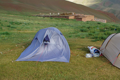 Your tent has to have qualities that are essential in this region: It has to be very strong and require only a few minutes to be pitched. Of course, it should be a double-shell tent, preferably with the ability of the outer shell to be pitched first. At high altitudes in Pamir and Alai the wind was blowing permanently. However, I don't know if it is in every season like this or only in July and August. Anyway during this trip even periods with weak wind were rare. Usually, the wind was strong — sometimes even so that I could barely stand on my feet. Also the soil was very stony and hard so that it was often almost impossible to fixate the tent firmly enough. This was a situation when the advantages of a good and therefore expensive tent were obvious.