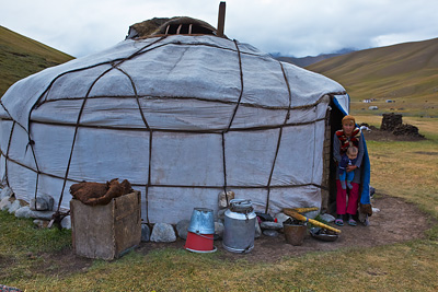 A yurt is a typical house of seminomadic pastoralists in Kyrgyzstan. These people are extremely friendly, and a traveller will be usually welcome to stay in their yurt. (Click on picture to enlarge.)