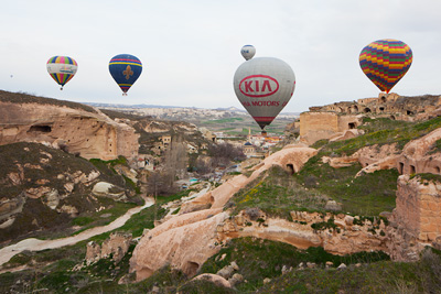 Air balloons flying tourists over Cappadocia. In the morning the sky was usually full of them, and then they often appeared in landscape shots. Sometimes it was quite irritating. (Click to enlarge.)