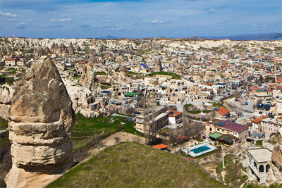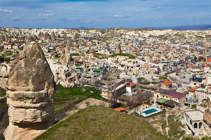 In Cappadocia I stayed in a small hotel in Göreme that is just inside the Göreme National Park. Göreme is officially a village but to me it looks more like a small town. Among such towns in this area it is the smallest but there are some smaller "real" villages too. Overall, there is too much population and too much economic infrastructure in this national park for the nature to be preserved. (Click to enlarge.)