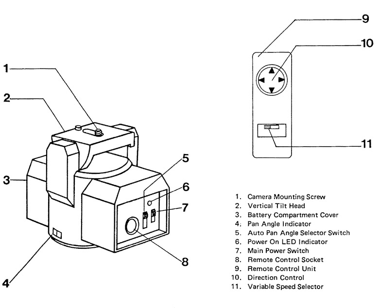 - Wired remote control for tilt direction — up and down — and for panning speed and direction — left and right.