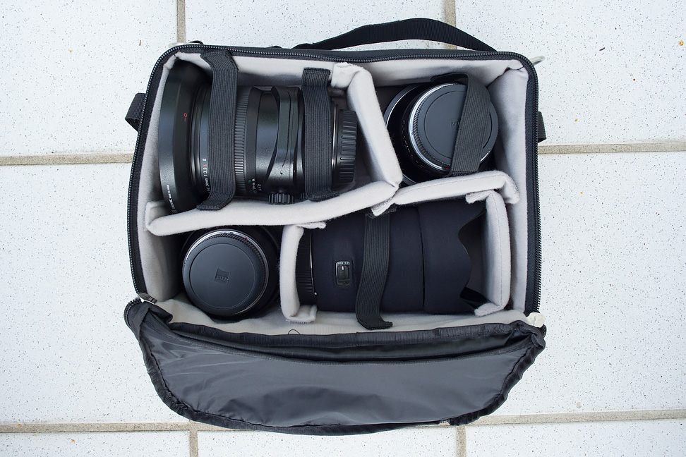The Shallow Small ICU is really small. As shown in the picture below, I typically would put the lens kit — 18mm, 24mm tilt-shift, 35mm, 85mm — into it that I use for landscape photography. No place for anything else would remain after that. The camera will have to be carried somewhere else.