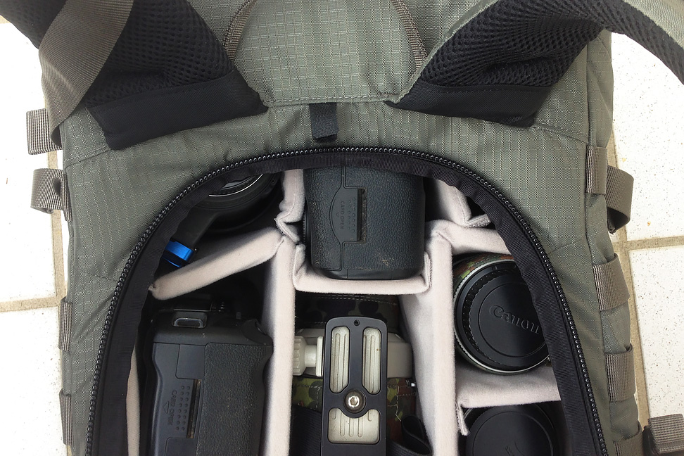 | Gura Gear Uinta | rear side access, fairly lightweight, through insert modules customisable space, harness and shape suitable for long carrying | no top access, too small for lenses with focal length above 300 mm, too little space for non-photographic gear and items (cloths, food, etc.), poor extensibility (limited possibilities for attachement of external add-ons). |